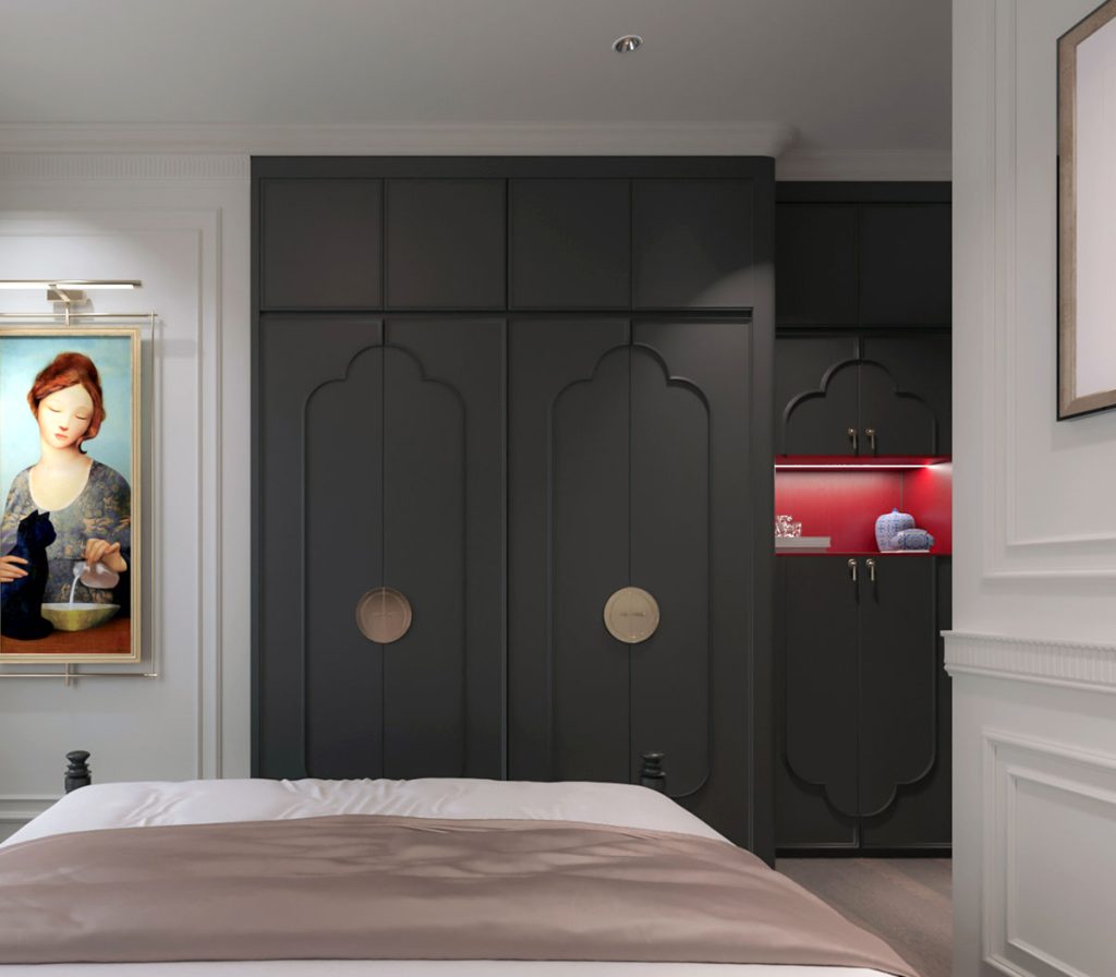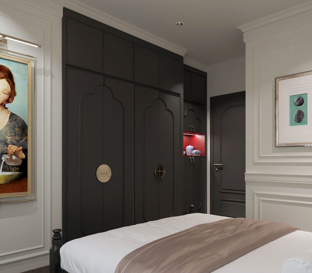 Tủ quần áo âm tường là một điểm nhấn rất mạnh mẽ. Cánh tủ được chạm khắc mềm mại đặc trưng của kiến trúc Á Đông. Các tay nắm tròn bằng kim loại màu vàng đồng càng làm tăng thêm vẻ sang trọng và nét Chinoiserie rõ rệt.